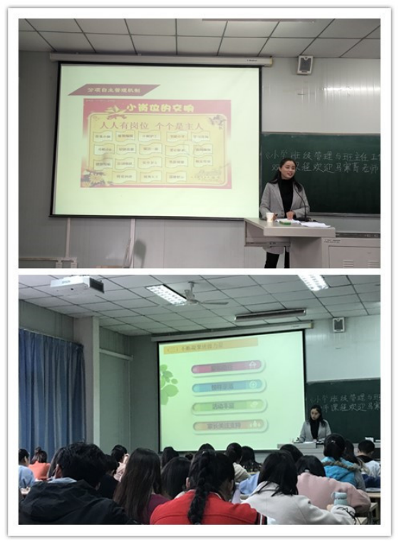 2019年10月23日下午7、8节课,beats365《小学班级管理与班主任工作》双师课程在1024教室如期继续进行。汉滨区红旗小学教导主任马寒菁老师给2017级小学教育文科1班、2班的同学们带来了一堂内容丰富的班主任课。