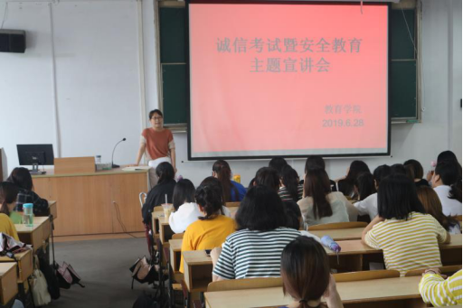 会上董婷瑜老师首先强调了考试诚信的问题,紧接着郇红老师重点强调了暑期的安全问题,嘱咐同学们暑期要注意以下事项:1.假期内个人出游时要注意收好物品,防止贵重财物裸露在外,引起他人歹念,危及自身安全。2.个人出游乘火车或大巴车时不要随便与陌生人搭讪或随便接受陌生人的搭讪,走亲访友时禁止乘坐“黑车”。3.与同伴出外游玩时要小心谨慎,尽量避免到山林、丛林茂密处或僻静处行走,也不要到未经开发的偏、远、险、陡的地方游玩,以免遇到危险,无法及时获得救援。4.部分同学假期留校兼职打短工要辨明所做工作的性质,如有非法经商或变相传教成分或变相宣传非主流意识形态言论的情况,尽早离开不要参与,以免陷入不必要麻烦,工作过程中如遇到利益纠纷,可以向辅导员或公司保卫处求助。5.18级专升本班与16级统招班计划考研的同学,要做好假期复习计划,利用假期夯实知识基础;没有考研计划的毕业班同学和17级同学假期也要做好学习计划,阅读一些教育类的经典书籍,丰富自己的教育理论知识。最后,预祝同学们度过一个愉快,充实的假期,平安返校!