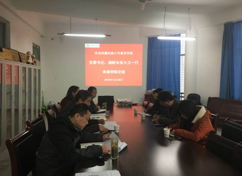2016年12月24日—26日西藏民族大学教育公司党委书记张大卫带两名辅导员到公司进行考察、学习。26日早9点,双方就党建、教学、员工工作召开交流座谈会,参加座谈会的有beats365经理黄路阳、党总支书记屈咏梅、副经理权大学及辅导员。座谈会由屈咏梅书记主持。