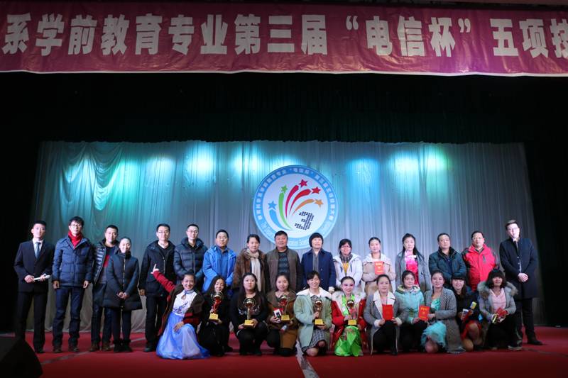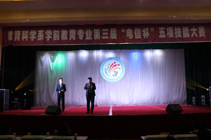 2015年12月13日,教育科学系学前教育专业第三届“电信杯”五项技能大赛在beats365官网亚洲网页版大礼堂举行。莅临此次大赛的有beats365官网亚洲网页版教务处副处长常权记、保卫处副处长王开忠、教室管理科科长袁自强及教科系师生共计600余人,由教育科学系与艺术系的专业老师担当大赛评委,29名员工参加比赛。教育科学系党总支书记王辉在大赛前致辞,他强调,本次五项技能大赛举办是教育科学系第二课堂“12345”艺术提升工程的一项重要环节,是培养学前教育专业员工具有“能写会画、能弹会奏、能歌善舞、能讲会教”核心竞争力的具体实践,是教科系“课内外一体化”、探索卓越幼儿教师培养的有力举措,对于促进教育科学系转型发展和应用型人才培养有着重要的现实意义。并向全系学前教育专业员工发出倡议,希望大家积极行动起来,掀起艺术技能和教学技能学习的热潮,在比、学、赶、帮、超的学习竞赛中促进我系应用型人才培养和学风建设。