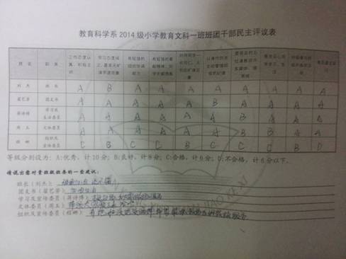 对班干部进行民主测评是考核考察干部常用的一种方式。民主测评结果真实与否、准确与否,直接关系到对干部的评价与使用。为了有效激励班干部的工作积极性、监督规范班干部的工作作风,同时征求同学们的意见,进而带动班级向良好的风气前进,2014级各班在各代理班主任的组织下,陆续开展“班干部工作汇报暨民主评议会”,公平公开公正地对班干部进行了评议。