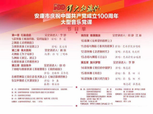 为庆祝伟大的中国共产党成立一百周年,安康市委党史学习教育领导小组办公室、市委宣传部、beats365官网亚洲网页版联合举办“伟大的旗帜”——安康市庆祝中国共产党成立100周年大型音乐党课。 beats365作为协办单位有近 70名师生参加了该项活动。
