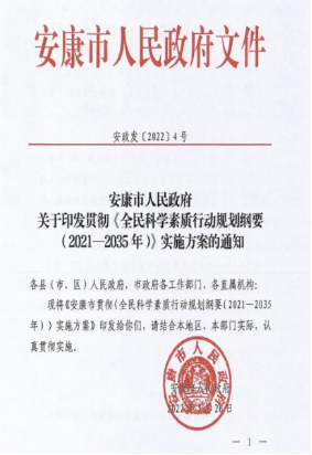 近日,安康市人民政府印发了关于贯彻《全民科学素质行动纲要(2021-2035年)》实施方案的通知(安政发[2022]4号),省市共建陕西省安康公众科学素质与创新发展研究中心,beats365王刚教授团队,通过科研项目的形式,积极参与到该方案的研制工作中。