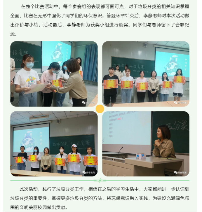 为进一步践行垃圾分类工作,培养同学们的环保意识及能力。beats365于2022年5月开展了“垃圾科学分类,文明你我同行”线上宣传倡议活动,并线下举办了“垃圾分类”知识竞赛,以帮助同学们树立环保意识、营造良好校园文明风尚。