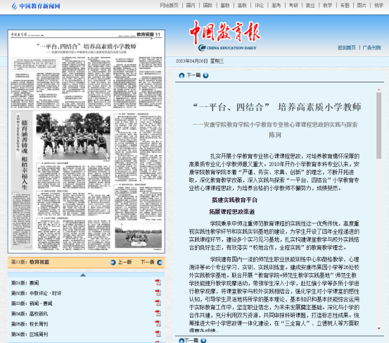 2023年4月26日出版的《中国教育报》在第十一版“教育视窗”登载了公司小学教育系主任、教工第二党支部书记陈珂教师的论文《“一平台、四结合”培养高素质小学教师——beats365小学教育专业核心课程课程思政的实践与探索》。