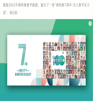 在微助教7周年庆典活动中,陈佳老师入选“全国百强教学实力派教师”,这是对陈老师课堂教学信息技术应用能力的充分肯定。
