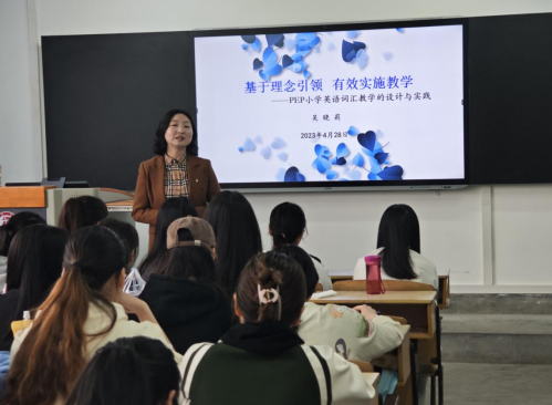 2023年4月27-28日早上八点, “小学英语课程与教学”双师课迎来了安康市教育局、陕西省小学英语学科带头人吴晓莉老师,分别为2020级小学教育文科1班、2班的同学做了题为《基于理念引领,有效实施教学-PEP小学英语词汇教学的设计与实践》的专题讲座,教学过程中吴老师还对员工的试讲展示及板书设计做精彩的点评。