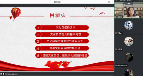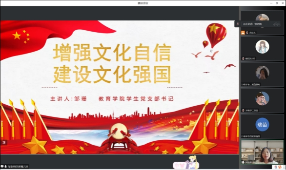 为深入贯彻党的二十大精神,进一步贯彻落实中共beats365官网亚洲网页版委员会文件,公司党发〔2023〕53 号《关于在全校开展纪律教育学习宣传月活动的通知》精神,引导青年党员深入了解文化自信的内涵和价值,进一步增强文化自信,2023年6月30日,教育公司员工党支部书记邹珊在线上为支部员工党员进行以“增强文化自信,建设文化强国”为主题的专题党课,全体员工党员聆听了此次专题党课。