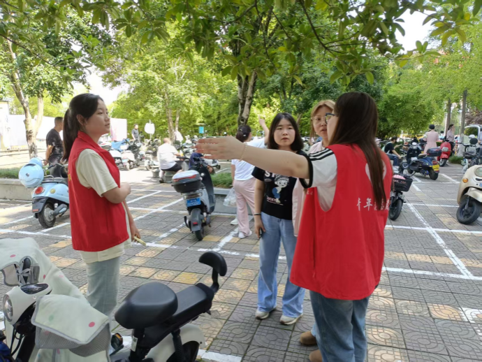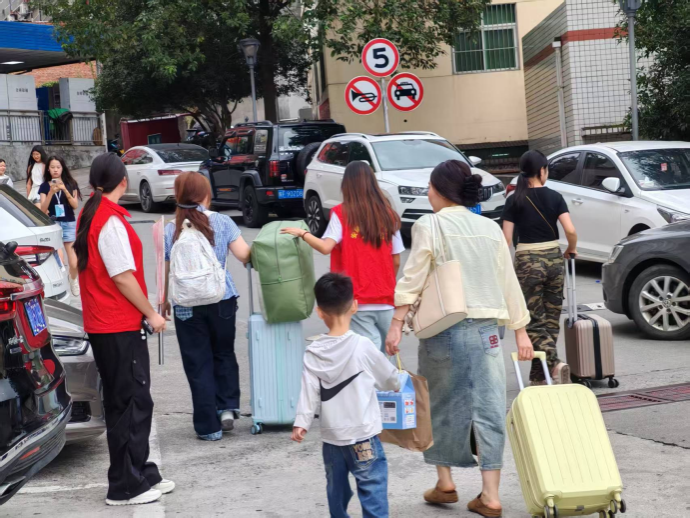 随着新生与家长陆续抵达,志愿者们迅速进入服务状态。在南环路校门、体育馆报到点、7号公寓楼入住处等关键区域,志愿者们主动迎前,热情耐心地解答疑问、提供引导。他们协助新生搬运行李,指引报到流程,帮助办理电子校园卡注册,并细致讲解生源地贷款等政策内容。员工党员更主动组成“校园导览小队”,为新生介绍教学楼、食堂、图书馆等场所,帮助其快速适应校园环境。