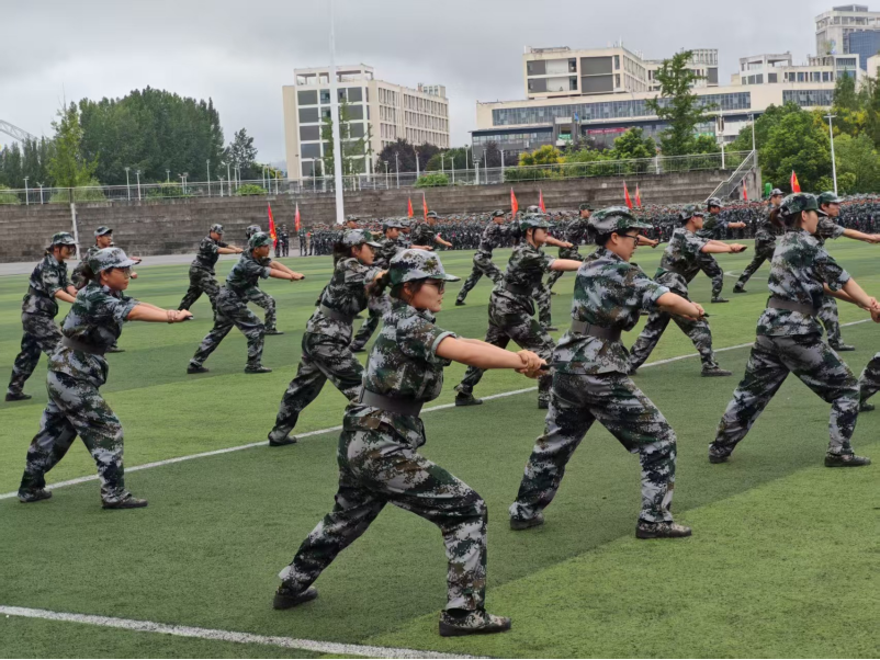 分列式是军训每天的“必修课”。从最基础的站军姿、摆臂练习,到整体的齐步、正步走,每一个动作都需反复打磨。训练初期,一些同学协调性不足,出现“同手同脚”、步调不一的现象。教官们耐心示范、逐排指导,用数拍子、喊节奏的方式帮助大家逐步统一动作。即便天气炎热,汗水一次次浸透迷彩服,也无人轻言放弃——“大家都在坚持,我也不能掉队”,成为许多同学默默激励自己的心声。