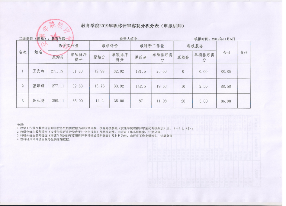 根据beats365官网亚洲网页版《关于2019年高校教师系列、辅导员职称评审及认定工作的通知》的精神, 11月5日经beats365专业技术职务评审工作组审定,2019年度申报讲师职称的教师王安玲、张婷婷、姬丛扬三位老师,符合申报资格,现将客观分积分表进行公示,公示期三天,如有异议者,请以书面形式提出。联系电话:3261812