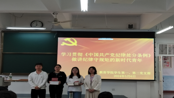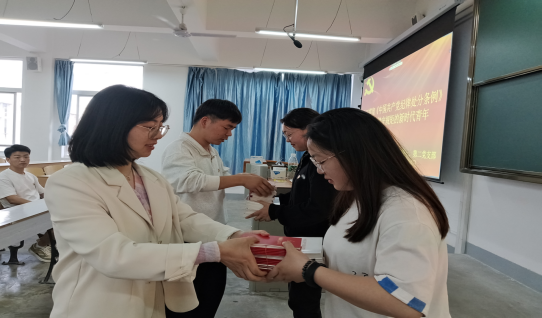 大会第一项,唐丹和邹珊为全体党员颁发《中国共产党章程》及《中国共产党纪律处分条例》,督促指导支部党员,要在学习好贯彻好《中国共产党纪律处分条例》上下功夫,做到知规守纪,严格自律。