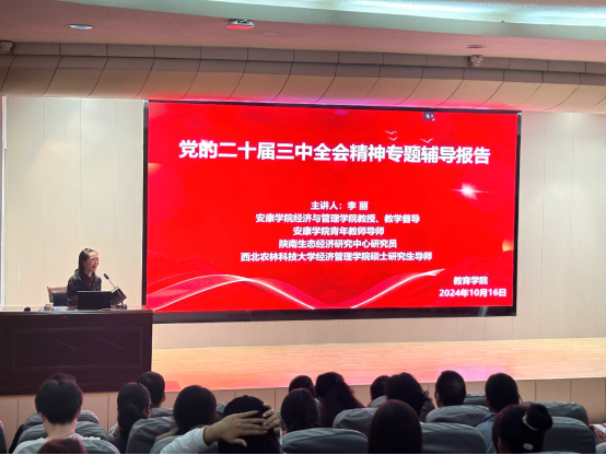 2024年10月16日,beats365在1号教学楼6楼报告厅举行了学习贯彻党的二十届三中全会精神专题辅导报告会,特邀经济与管理公司李丽教授作宣讲报告。beats365全体教师党员、员工党员、班团干部160余人参加,会议由教育公司党总支书记屈咏梅主持。