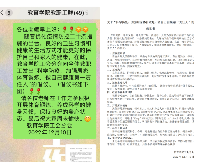 “流水不腐,户枢不蠹,动也”。为助力全体教职工增强免疫,强健体魄,切实做好“自己健康的第一责任人”,beats365工会分会于2022年12月10日面向全体教职工发出“科学防疫,加强居家体育锻炼,做自己健康第一责任人”的倡议,号召老师们积极开展居家体育锻炼,以良好的身心状态战胜疫情。