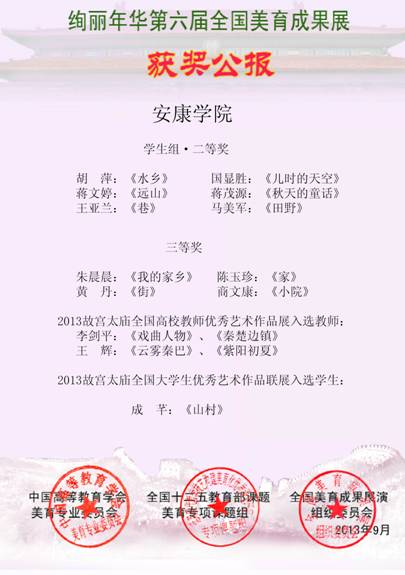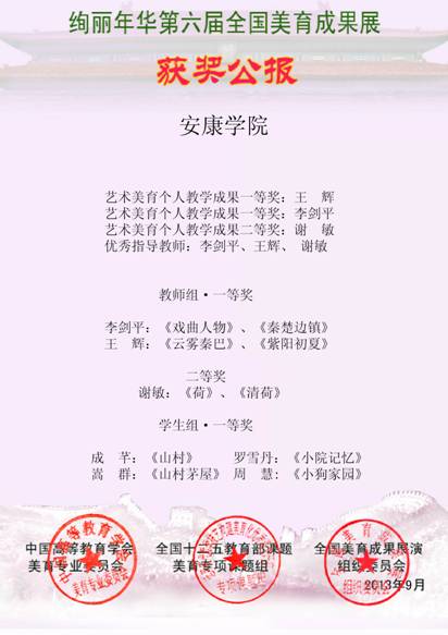 绚丽年华全国美育成果展最早是由教育部所属中国老教授协会、中国教育学会、北京音乐家协会、中国教育学会美育专业委员会、中国高等教育学会美育专业委员会、中国教育学会音乐教育分会等多家单位联合发起的美育成果展示评比活动,该活动宗旨是:推崇美育、推介美育、推动美育、推进美育、推广美育、推新美育。为推动中国教育的美育化进程发挥了重要作用,已成为目前国内唯一的以推动美育为目的的权威品牌。绚丽年华全国美育成果展的展评内容包括三大类:即:社会美育成果展;校园美育成果;家庭美育成果。此次获奖,展示了我系在员工美育工作上取得的成绩,从而进一步推动我系员工第二课堂活动的开张,促进员工艺术技能的培养和艺术修养的提高。