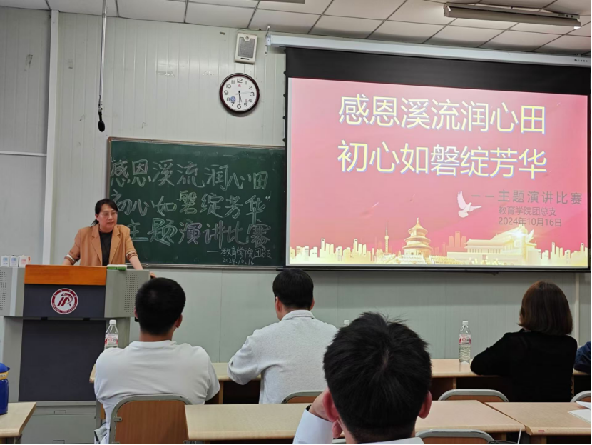 10月16日,决赛在1028教室举行,教育公司党总支副书记郇红和各年级辅导员担任评委。决赛现场气氛热烈,选手们精神饱满,他们用最真挚的情感、最动人的话语,表达着对家人、老师、国家的感恩之情。有的同学讲述了家人的默默付出,让人潸然泪下;有的同学回忆起老师的谆谆教诲,令人感怀不已;还有的选手抒发了对祖国的深深热爱,让人热血沸腾。