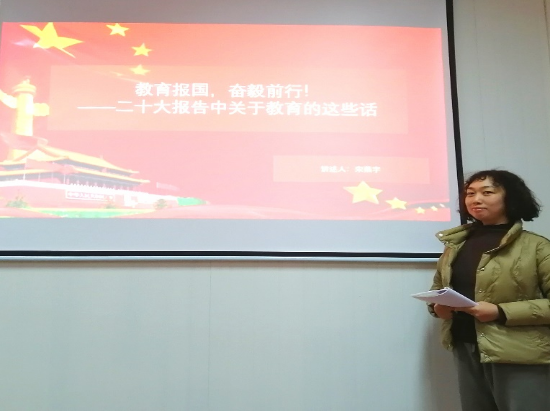 首先,宋燕宇对二十大报告中关于教育的表述进行了梳理,强调了我们要坚持教育优先发展,办好人民满意的教育。其次,对相关表述展开分析:党的二十大报告统筹教育、科技、人才三方面工作,将“实施科教兴国战略,强化现代化建设人才支撑”列为专题进行整体论述、作出整体部署是报告的一大亮点;“加快建设教育强国”是党的二十大报告的新提法;“加快建设高质量教育体系”也是党的二十大报告的新提法,高质量教育体系是教育强国的重要特征;二十大报告中再次强调为党育人、为国育才,实质上是“为谁培养人、培养什么人、怎样培养人”这一根本问题做出了回答、提出了要求,也标明了我国教育事业的根本规定性。最后,全体党员教师对相关论述作了深入讨论,分享各自看法。