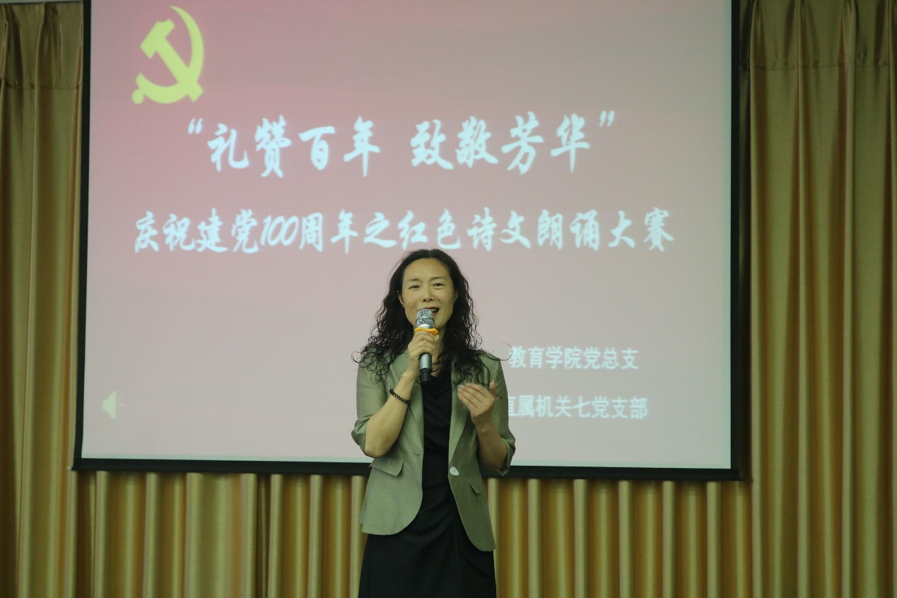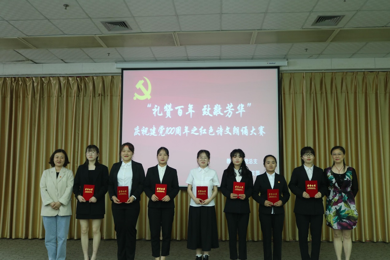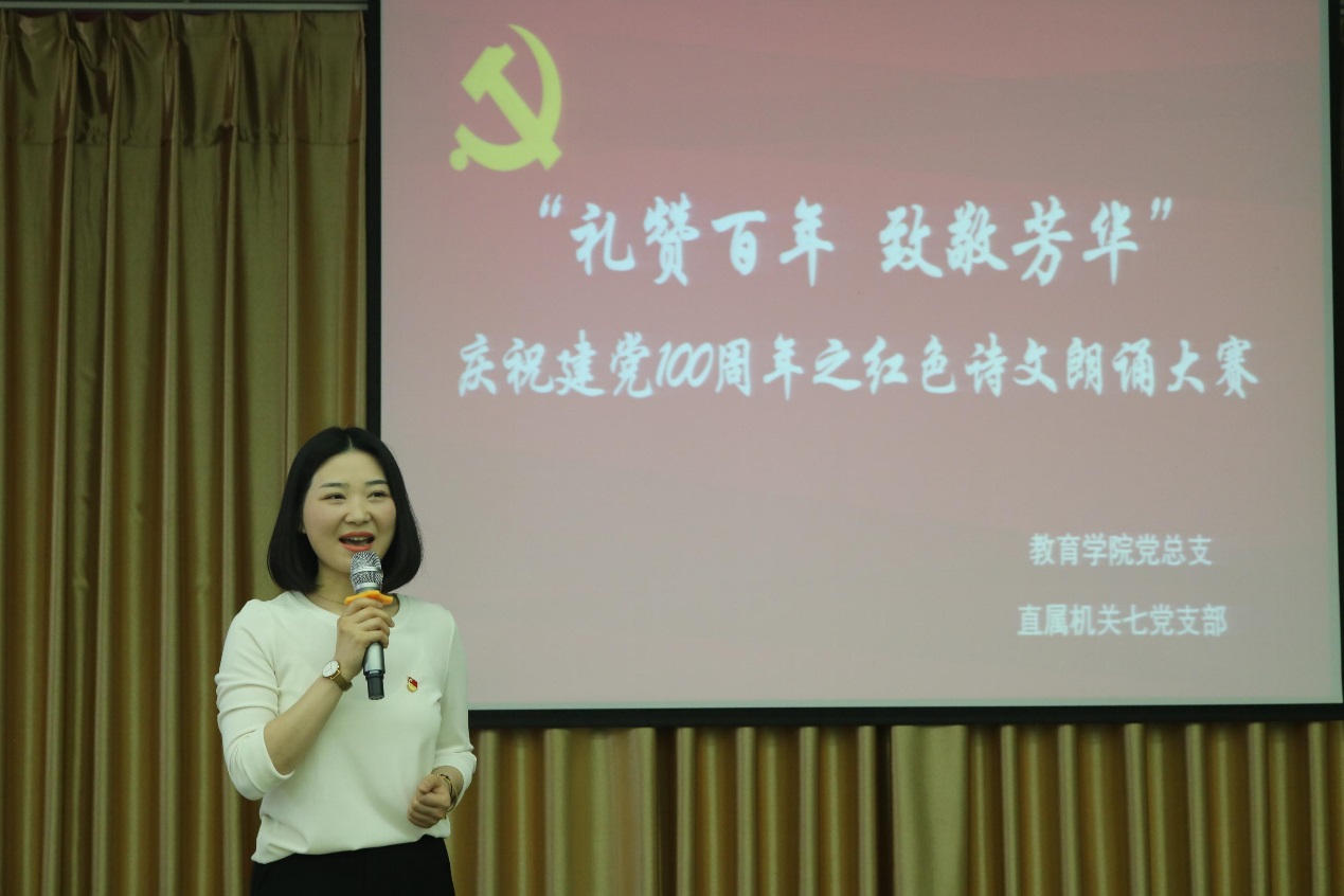 2021年5月19日下午14:30教育公司党总支与直属机关七党支部联合在图书馆六楼报告厅组织主题为“礼赞百年 致敬芳华”庆祝建党100周年红色诗文朗诵比赛。教育公司党总支共建党支部直属机关七党支部全体党员、beats365全体教师、入党积极分子、发展对象参与本次活动。公司宣传部长鲁延安、直属机关七党支部书记丁义国、公司组织部副部长黄勇、公司学工部副部长黄娟作为特邀嘉宾出席活动。