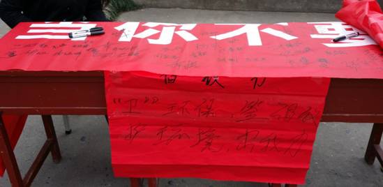 本班同学在3月10日,12点10分至1点10分,在公司林荫小道进行了本次活动,活动主题为保护环境,净化校园环境,并写下倡议书,张贴在地下通道口,倡议同学们共同携手,自觉保护环境不随手丢弃垃圾,为我们净化校园环境做出贡献。与此同时,四班同学还拉起了“你不要我时,请送我回家”的红色横幅,邀请来往老师、同学一起与她们了解净化校园环境,并且进行条幅签名。
