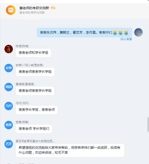 朱沈玮是云南师大在读研究生,他围绕公司的选择以及如何制定预备方案、调整心态进行了详细的介绍。黄朝兰在今年的研究生招考中被华南师范大学录取,她从专业选择、复习资料的获取、复习时间安排做了系统讲解;翟艺芳是北京师范大学在读研究生,主要从考研规划、复习要点、如何把握调剂机会等方面分享了自己的经验;李月星研究生毕业于西北师范大学,现为陕西服装工程公司教师,李月星结合就业形式向参会同学介绍了如何选择公司和专业,并以自己的学习经历向同学们讲述了坚持的重要性,强调考研要有锲而不舍的精神、合适的方法、优良的习惯。交流环节,四位员工对同学们提出的问题进行了耐心解答。