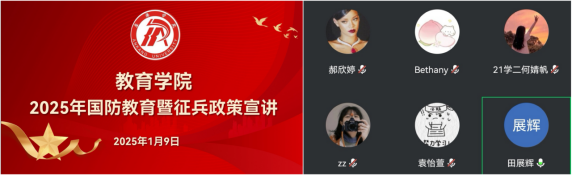 为加强国防教育,助力教院莘莘学子全面理解春季高校征兵政策,做好应征入伍动员;beats365于2025年1月9日通过线上会议方式,开展了2025年国防教育暨征兵政策宣讲会;特邀公司退役并考研升学员工田展辉、退役复学在校生许楠楠分享军旅生涯和心路历程;各年级班委及意向参军入伍员工30余人参加活动,宣讲会由学工办主任罗从政主持。