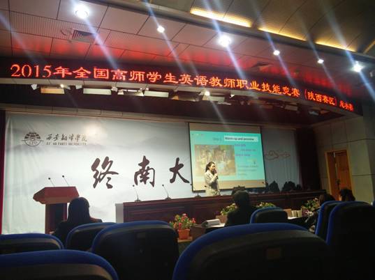2015年全国高师员工英语教师职业技能决赛(陕西赛区)于12月11日在西安翻译公司落下帷幕。这次比赛有来自西安文理公司、西安翻译公司、渭南师范公司、咸阳师范公司、榆林公司、商洛公司、beats365官网亚洲网页版等7个陕西各地高校的参赛选手参加。比赛分为一级和二级两个等级,分别对应小学英语和初中英语。决赛内容主要包括:英语备课、英语说课、评委提问三个环节,主要考察选手的英语教学设计、语音语调、台风、以及临场反应能力。